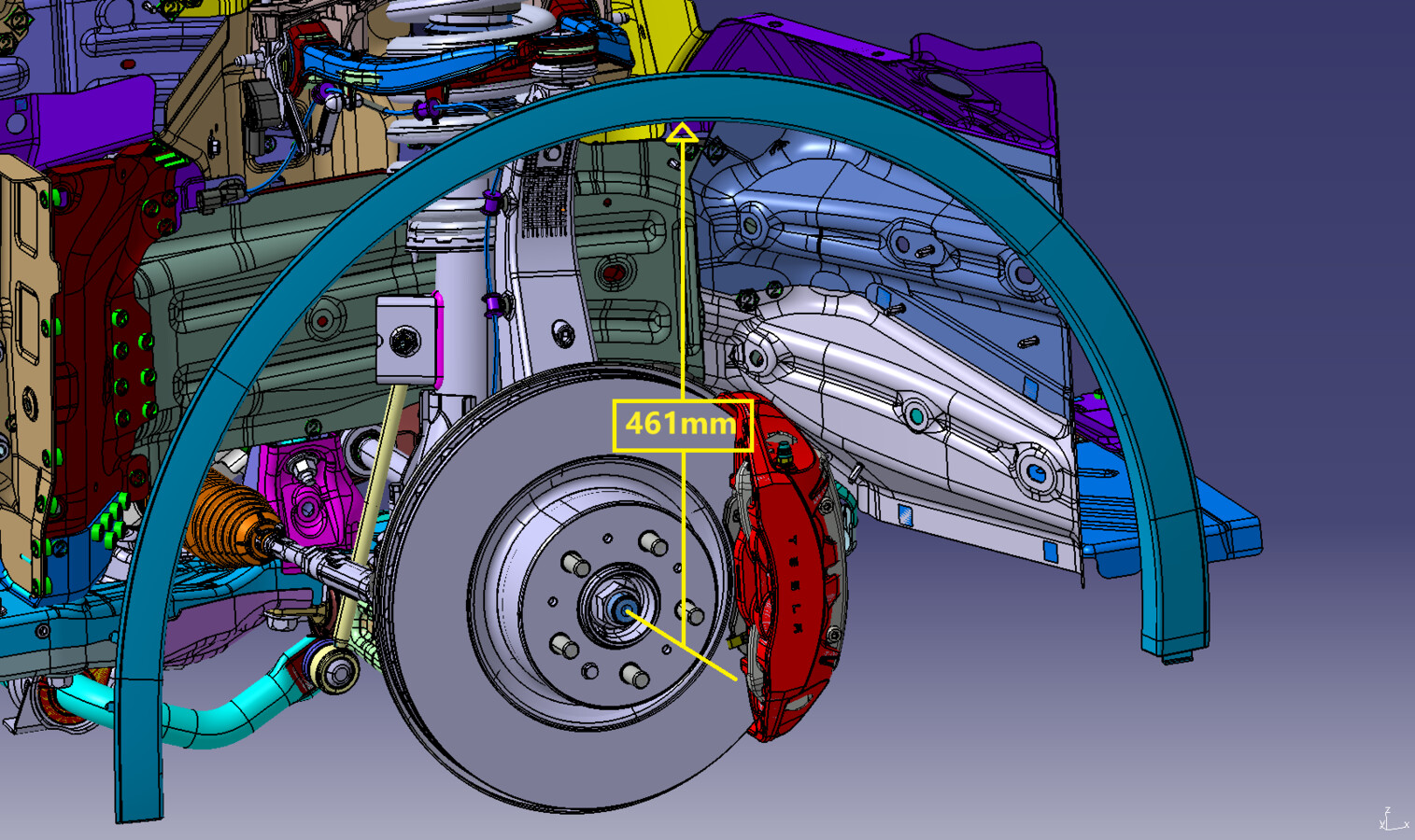 在左前轮毂轴承上安装一个轮毂轴承千斤顶适配器,然后使用支架将左前悬架支撑在行驶高度(461 毫米)。