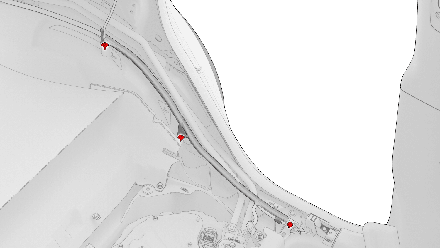 - 安装将左侧线束导件固定到车辆上靠近左后门槛区域的卡子(3 个)。