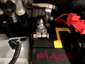 注1 个螺母,10 毫米,6 Nm,1 个连接器;接合锁片,首先连接紧急响应回路,然后再连接 12V 负极端子,以免损坏车载电脑
