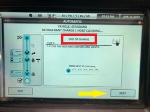 注重新加注制冷剂 1.02 千克(1020 克);对于 Robinair 空调机,按下 ESC 键,点击 “NOT ACCEPT”,不接受清理残留机油的步骤;完成后,按下 “next” 开始“加注结束”流程