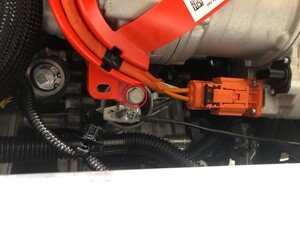 注操作高压组件时,务必佩戴个人防护装备(高压绝缘手套、护目镜),测量 B+ 至接地、B- 至接地、B+ 至 B- 的电压;如果电压大于 10V,则说明电池组触点开关未断开或熔焊;停止作业并联系维修工程部