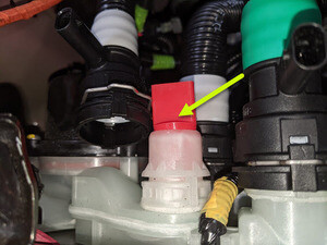 - 将重新加注工具盖从冷却液罐总成上拆下