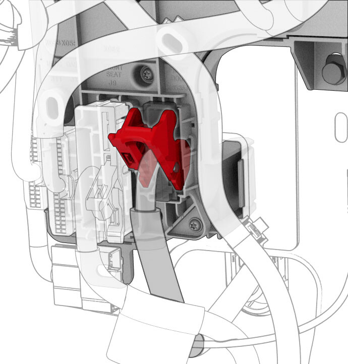 将 J9 副驾位座椅电气连接器连接到右侧车身控制器模块,然后接合连接器锁。