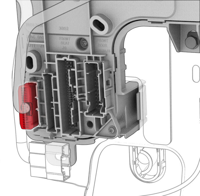 - 松开连接器锁,然后将 J1 电源电气连接器从右侧车身控制器模块上断开。