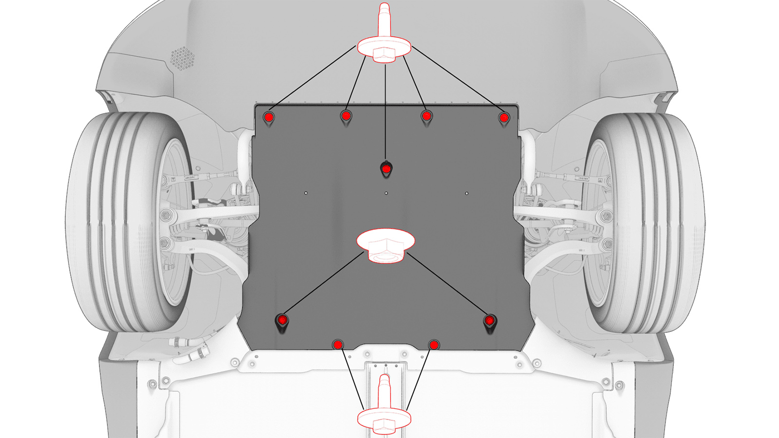 - 将前流线型护板安装到车辆底部,然后用手拧紧螺母(2 个),以暂时将护板固定到位。