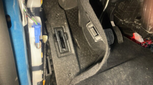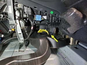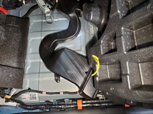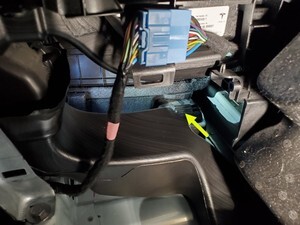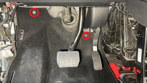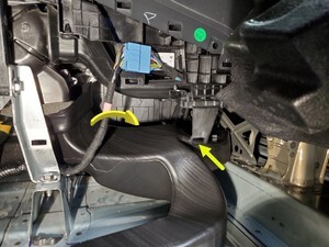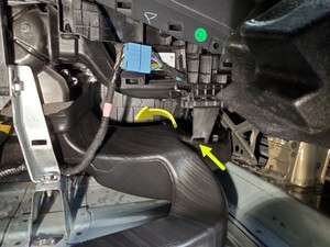 - 将 LH 脚部空间罩放置到车内,连接电气连接器 (x2),然后固定将此罩固定到车辆的锁片 (x3)。