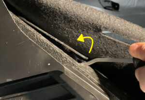 提示: 将夹子撬具插入夹子外侧,然后向右旋转,以松开夹子的一侧。将夹子撬具移至夹子内侧,然后向左旋转,以从驾驶室支架上完全松开毡毯夹。