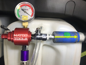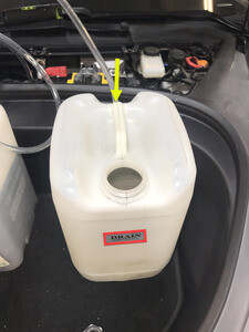 - 将冷却液重新加注软管放入注满冷却液的容器中,确保末端完全浸入