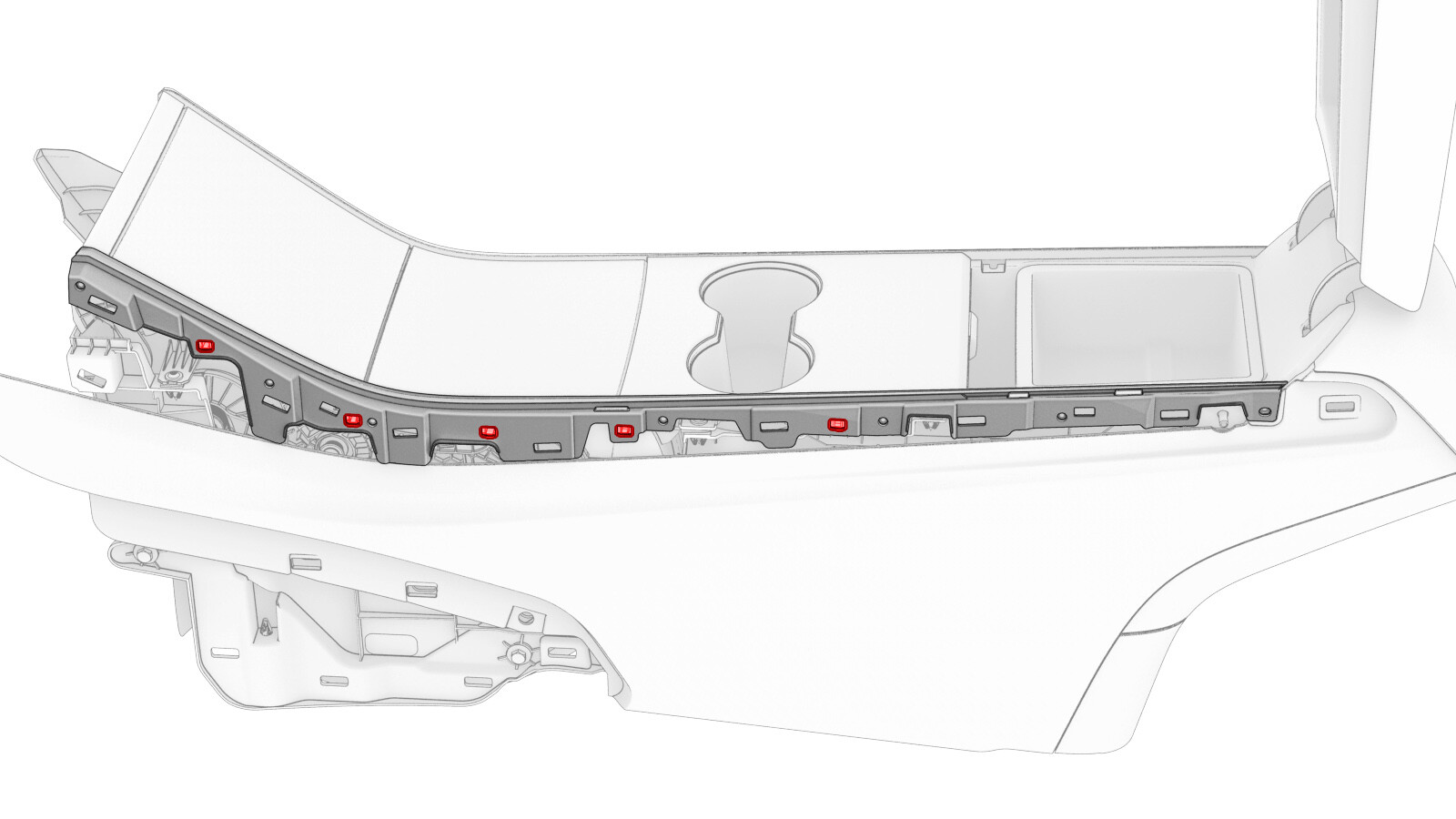 - 松开将中控台亮条固定到中控台的 6 个锁片,然后拆下亮条。