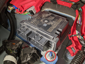 - 将约束控制模块抬离定位螺柱,然后将模块从升降器下方滑出,以将其从车辆上拆下。