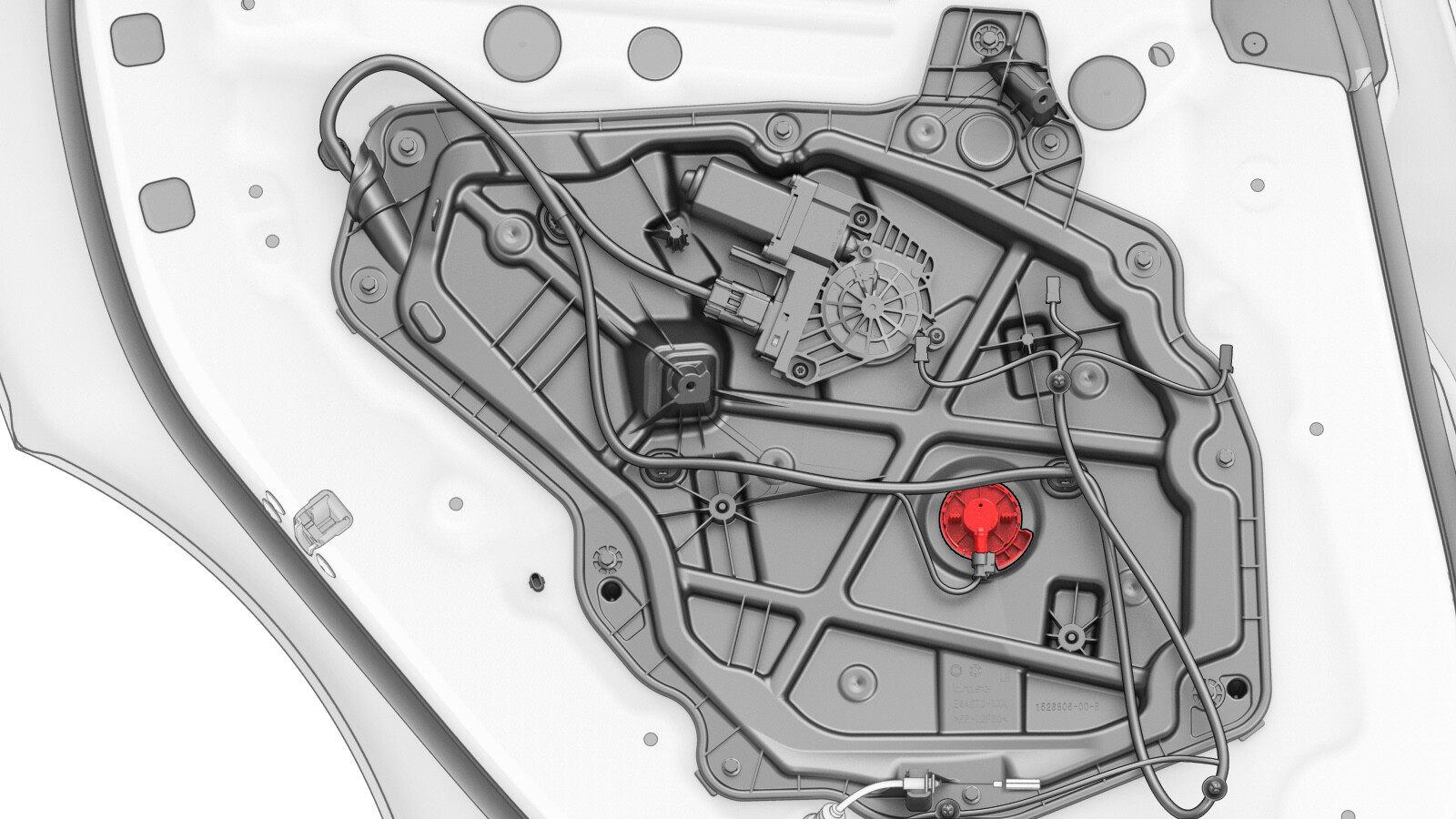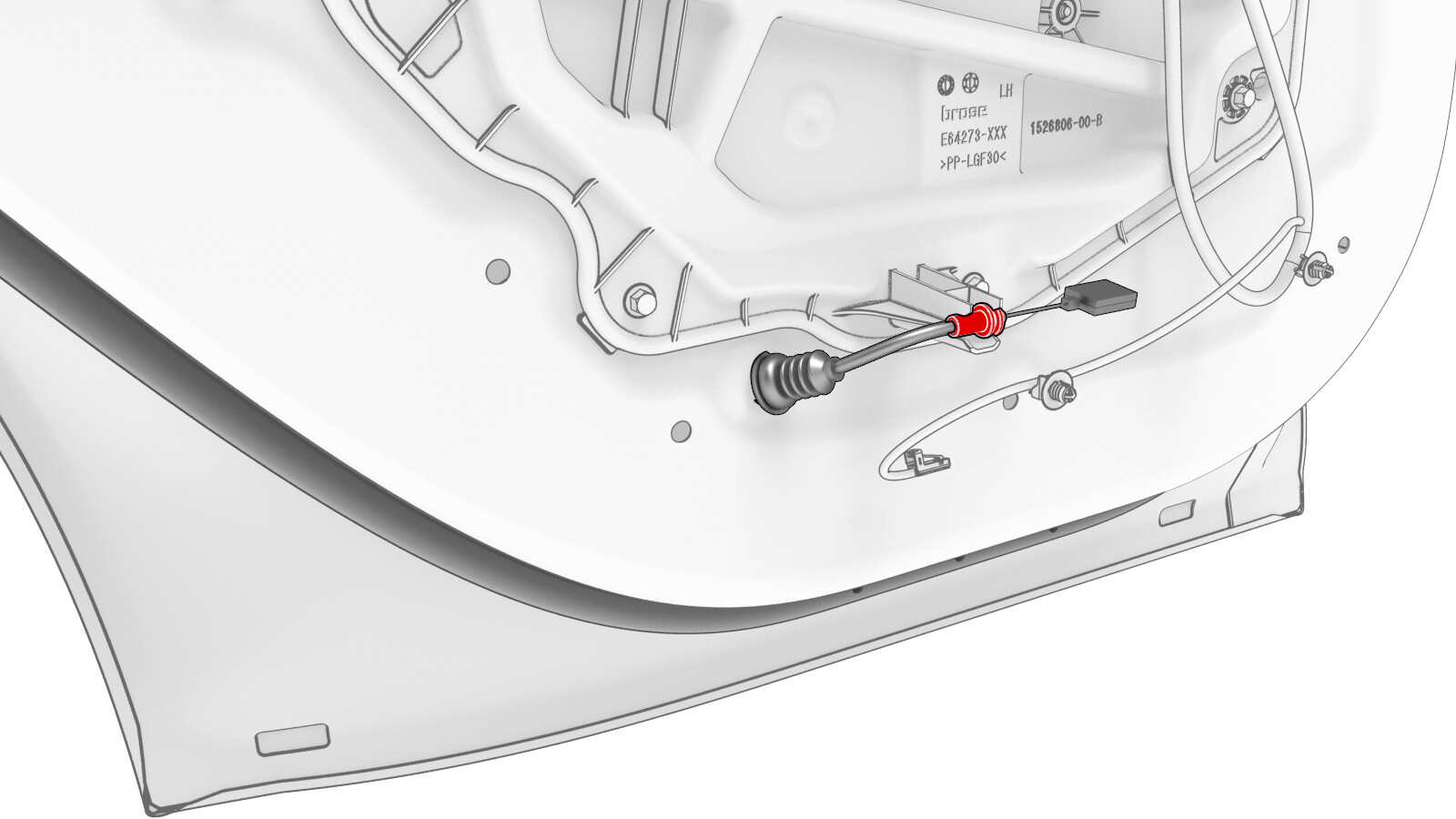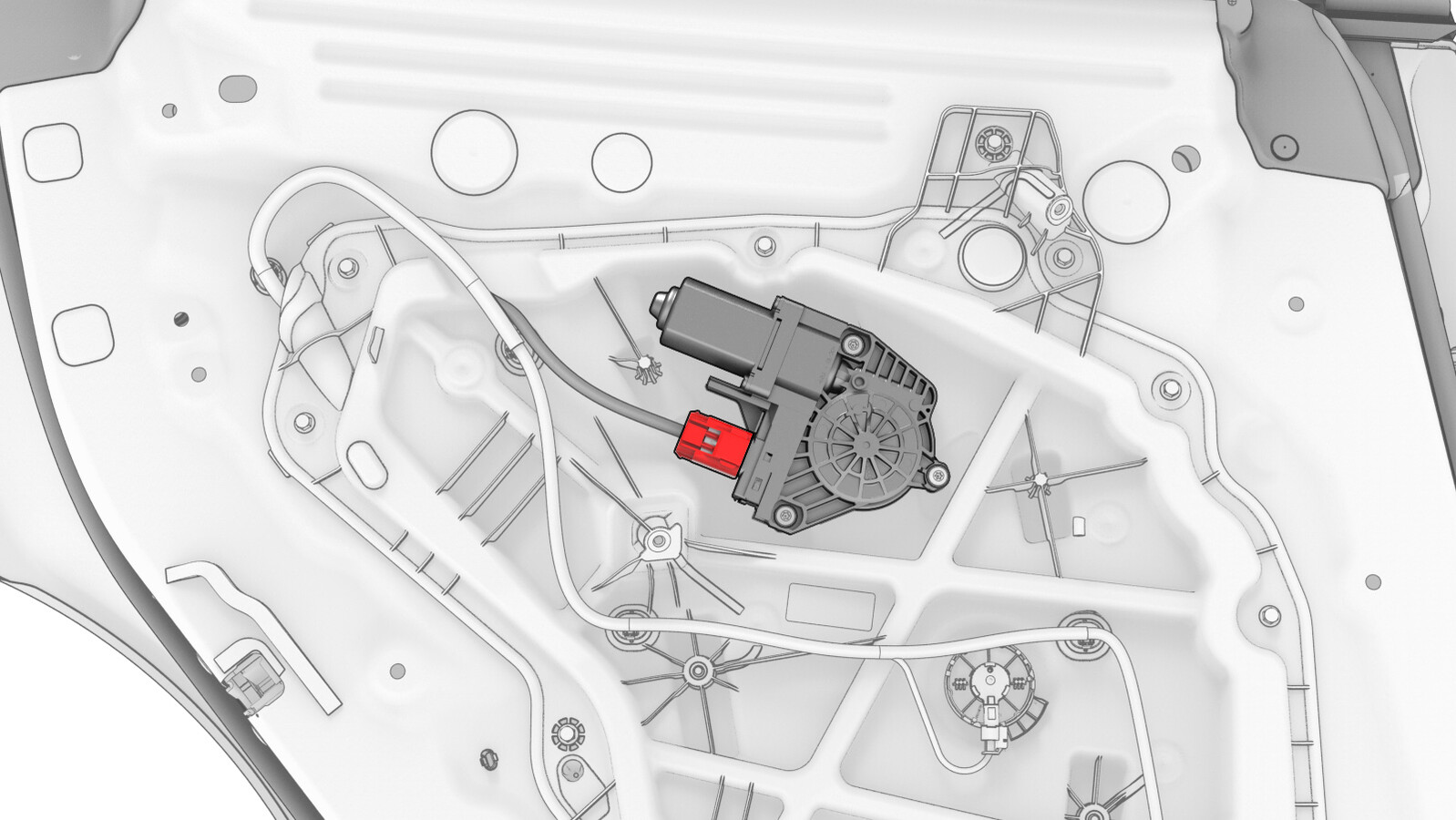 - 将电气线束连接到左后车窗电机/升降器总成连接器,然后紧固连接器锁。