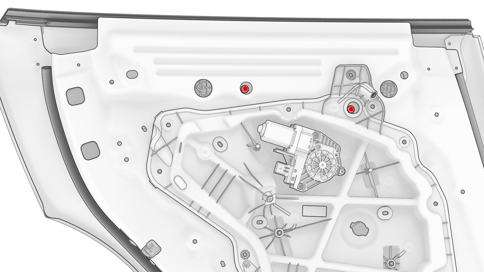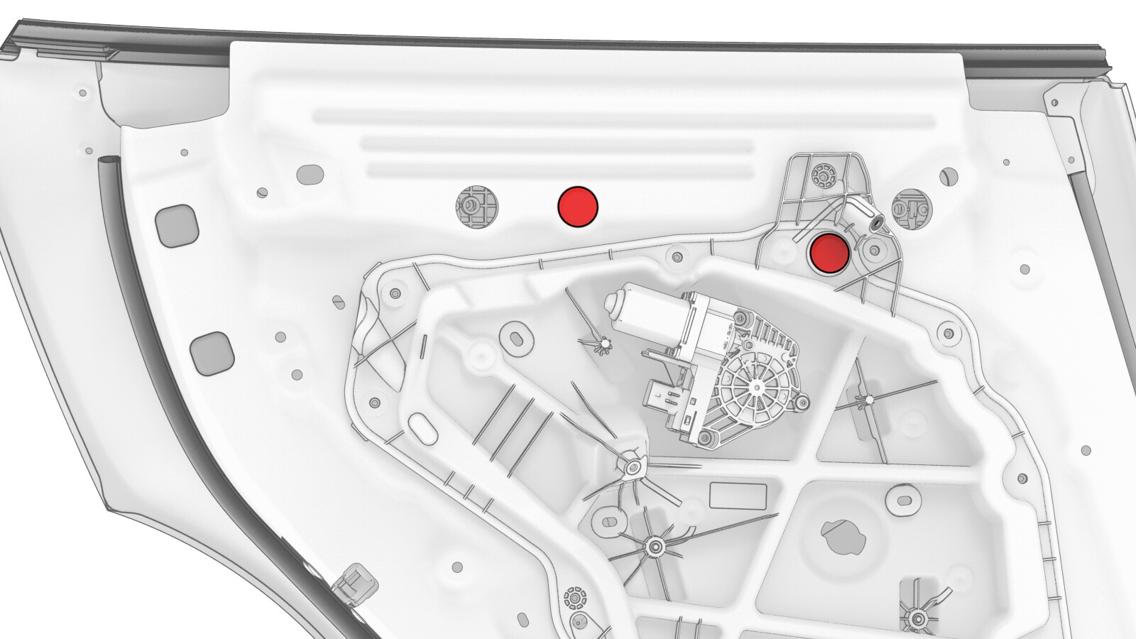 - 紧固将电气线束固定到左后车窗电机/升降器总成的夹子(3 个)。
