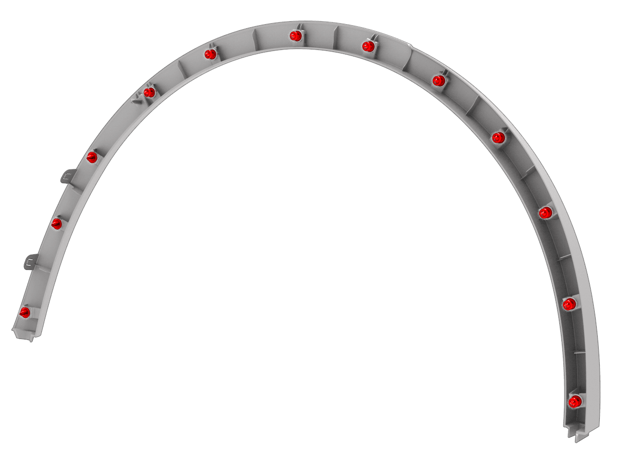安装完后翼子板饰板对准锁片后,在翼子板饰板每一端安装夹子,然后朝中央依次作业。
