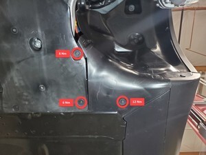 Apply Loctite 222 to the aero shield bolts (x2), and then install the aero shield bolts (x2) and rocker bolt that attach the LH front wheel arch liner to the HV battery.