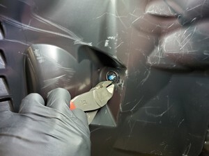 Remove the rocker bolt and aero shield bolts (x2) that attach the LH front wheel arch liner to the HV battery.