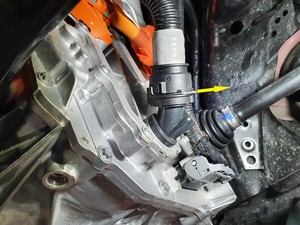 - 断开将后驱动单元逆变器入口管固定到液力联轴节的夹子和塞子 (x2),然后尽快塞住接头的端部。