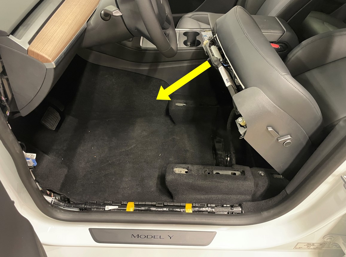 - 将左前地毯展开至原位,然后安装将地毯固定到左侧车门开口前部附近车身的卡子。