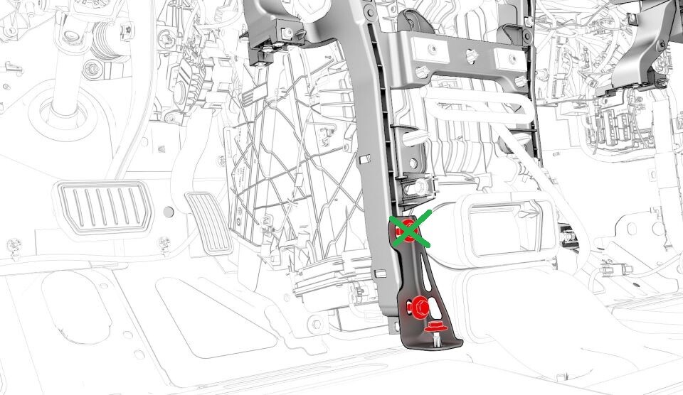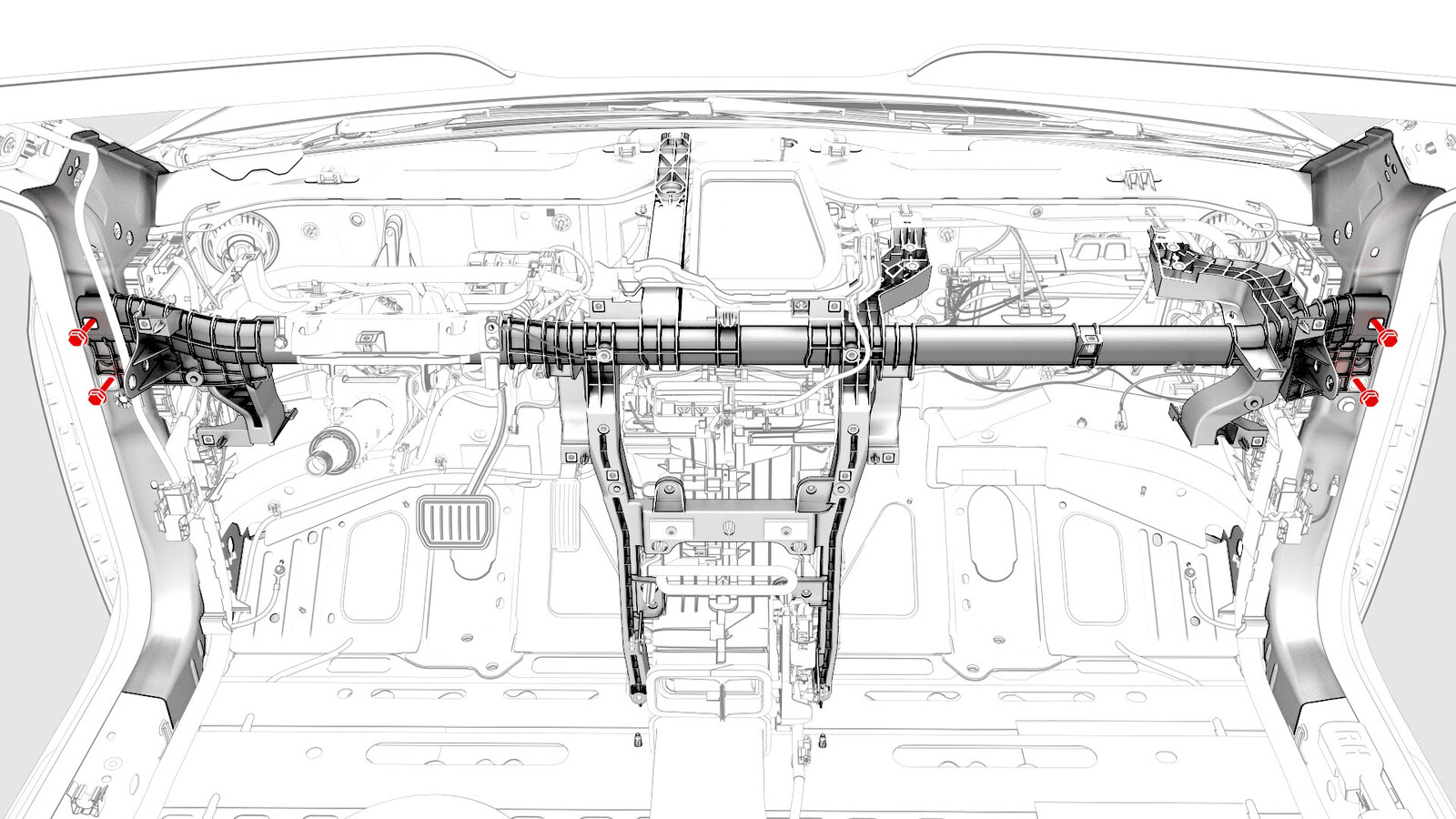 - 在暖通空调总成 LH 上部预装将横梁固定到暖通空调总成的螺栓。