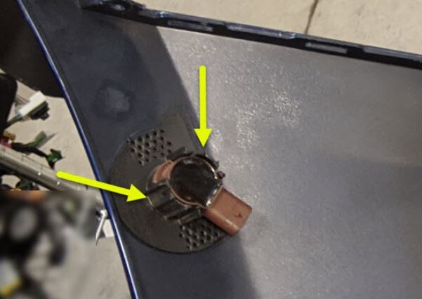 - 松开将后驻车距离传感器固定到后饰板的锁片,然后将传感器从后饰板上拆下。