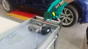 - 关闭制动液排放储液罐电源并将制动液排放储液罐从制动液排放适配器上拆下