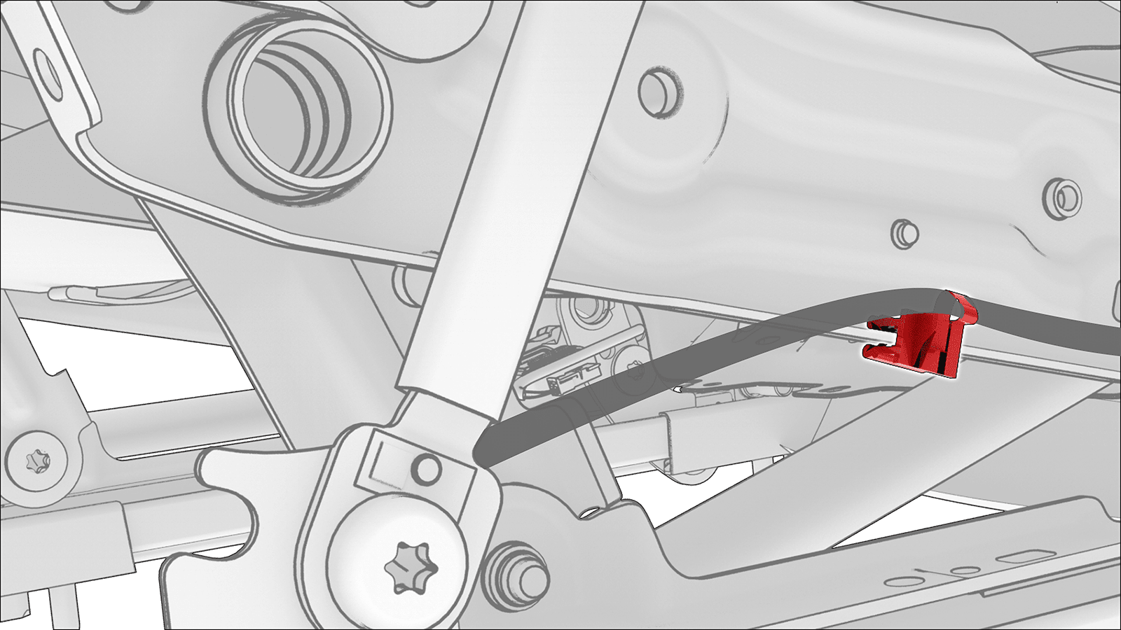 - 在座椅仍位于其最高位置的情况下,调节并固定沿座椅内侧滑轨分布的座椅安全带锁扣线束夹,然后验证线束是否尽可能向前延伸,使夹子背面没有松弛。