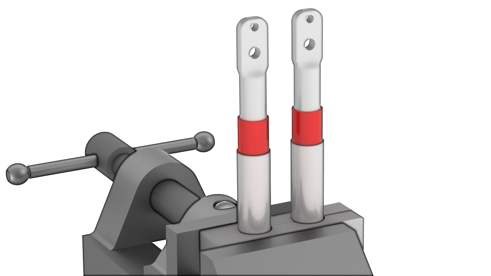 在母排上安装母排高压连接器夹,然后将夹子和母排固定到台钳上(如图所示)。