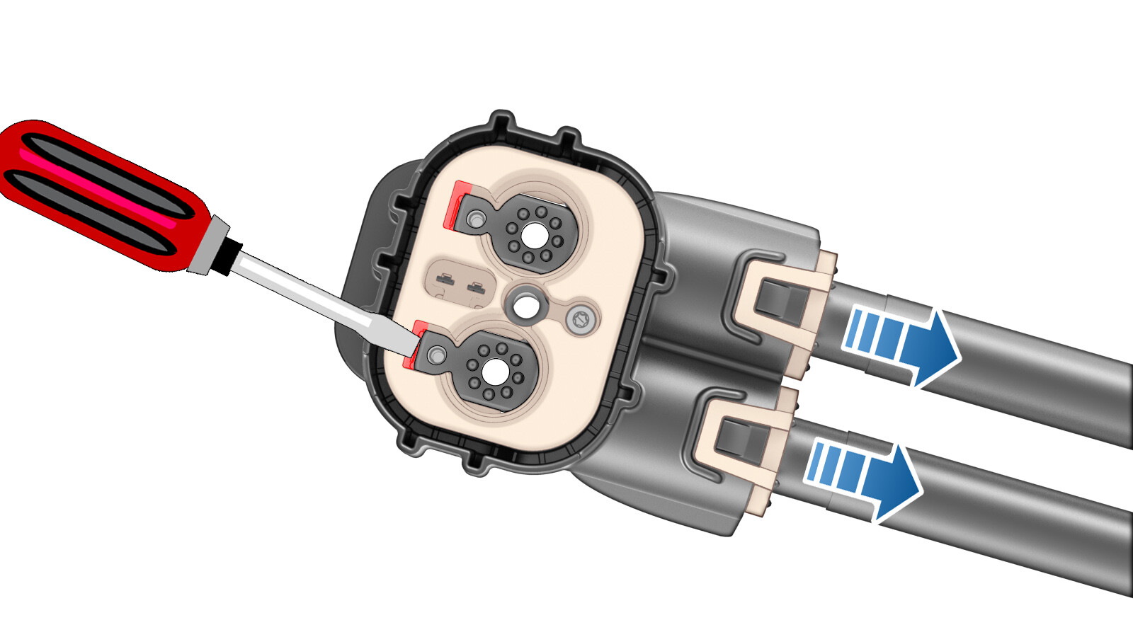 注径直拉离母排。如果不径直拉动,母排引线将无法与连接器分离。提示: 如果需要,在连接器外壳内侧与母排引线的端部之间(红色标示)嵌入一把一字螺丝刀,然后小心地将引线撬离连接器。切勿损坏母排引线的接触表面。