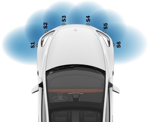 内侧驻车距离传感器为 S3 和 S4。外侧驻车距离传感器为 S1、S2、S5 和 S6。请参阅 传感器 - 驻车距离 - 外 - 前(拆卸和更换)