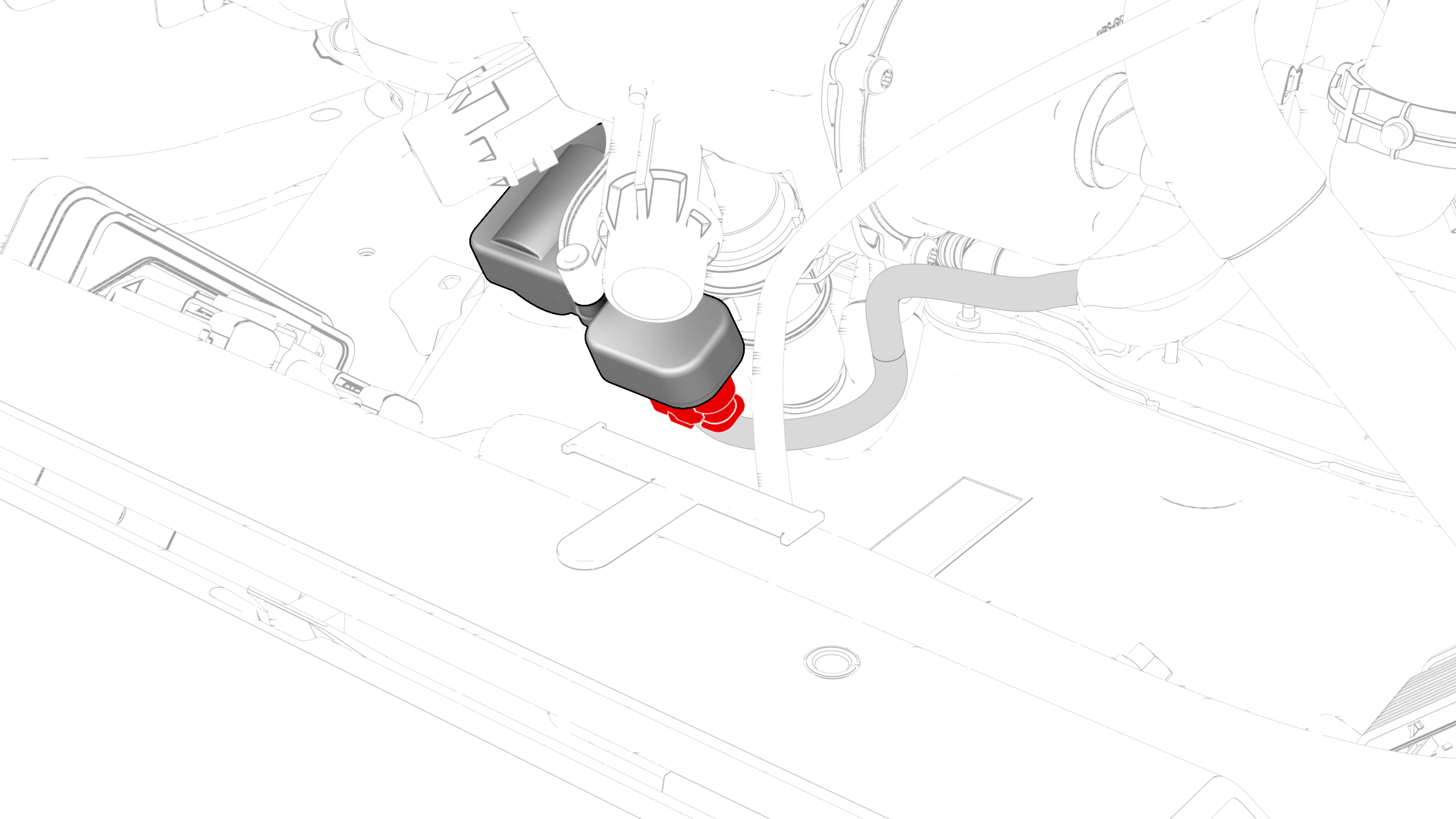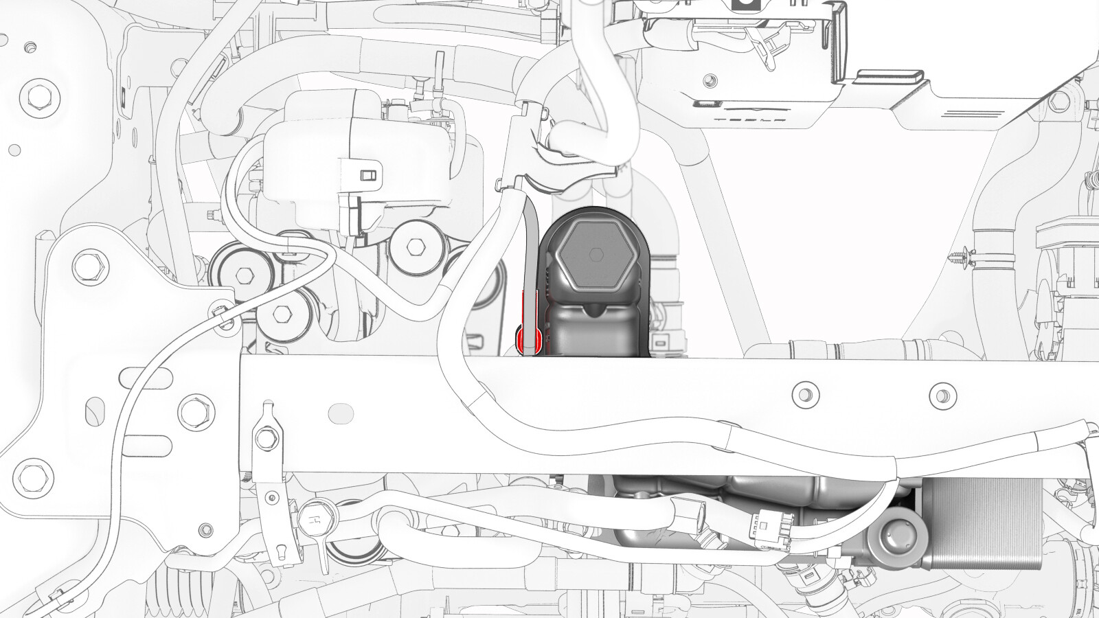 - 松开卡子并从超级瓶右后侧断开动力总成泵至门槛连接器软管。