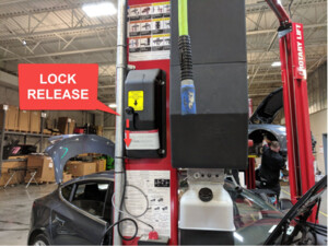 注将举升机升离锁止位,然后固定住释放杆,使锁具在降下车辆时保持活动自如