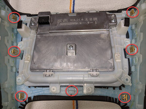 - 松开固定锁片 (x2) 和定位锁片 (x2),从中控台饰板上拆下感应式充电器模块。