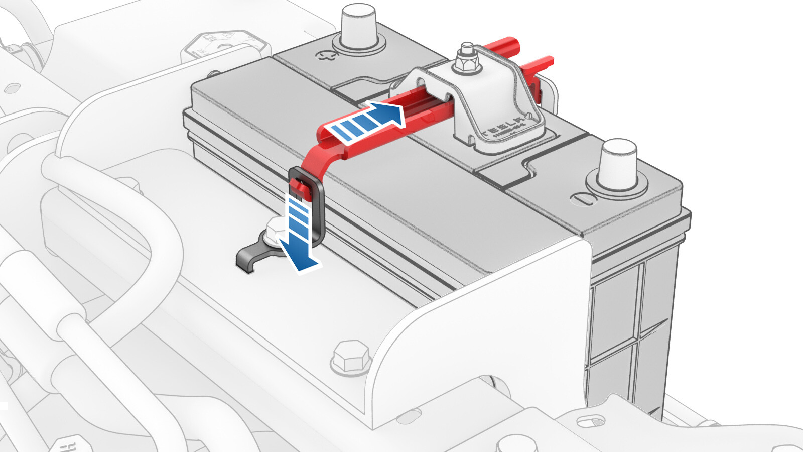 - 向下推动并将 12V 电池系带滑至后部,以便将其从前侧挂钩和后侧拉紧装置总成上释放。