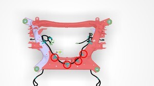 - 安装将副框架线束固定到副框架顶部的夹子 (x4)。