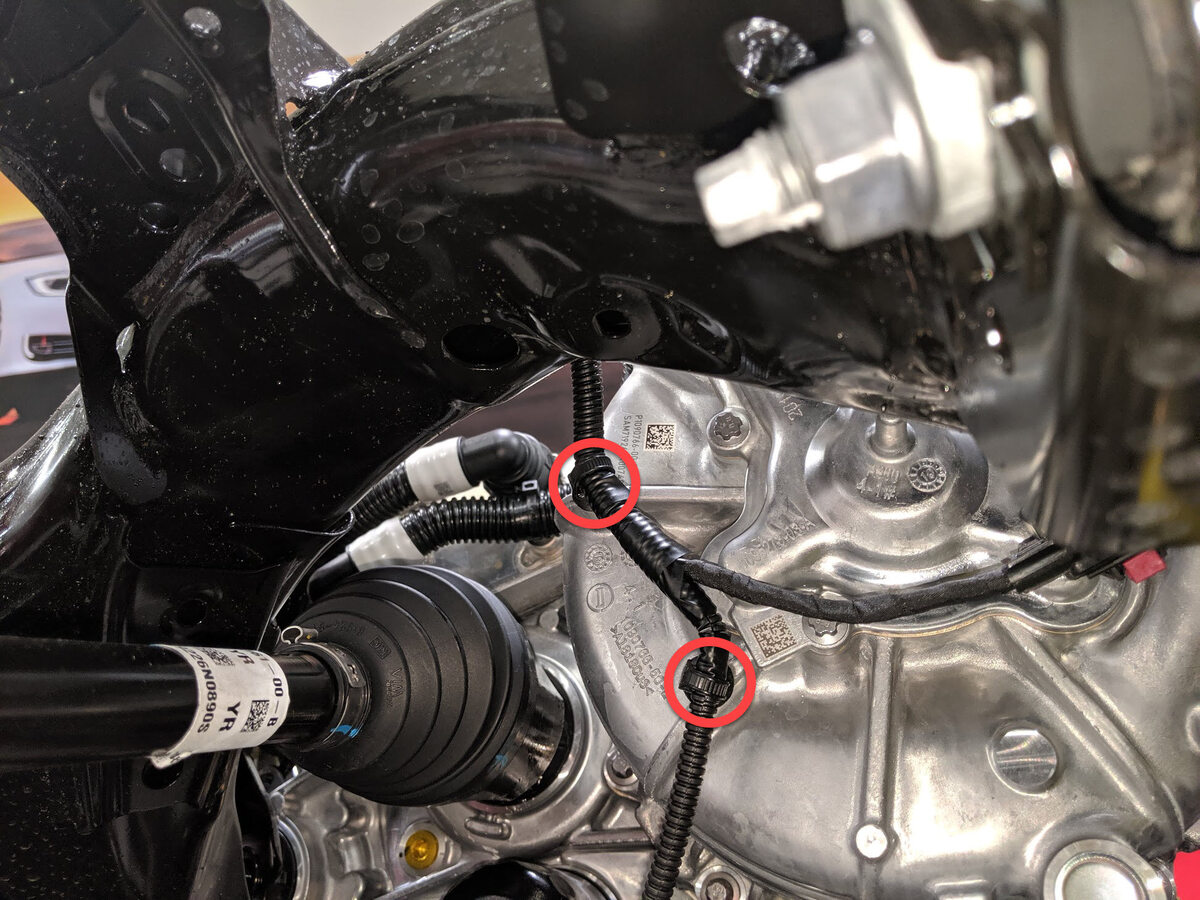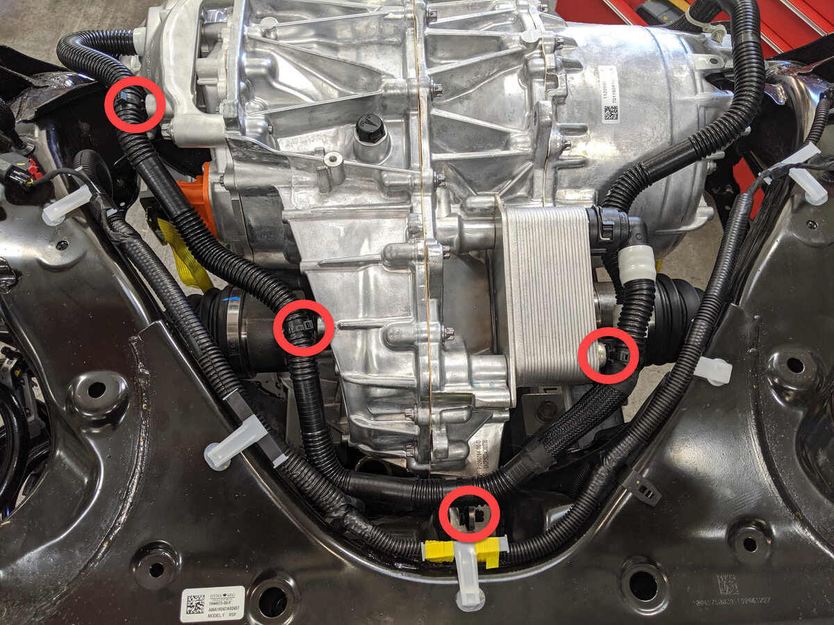 - 松开将后副车架线束固定到后驱动单元的夹子(2 个)。