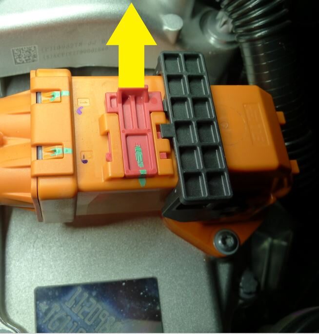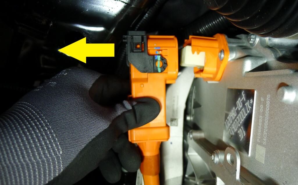 - 滑动红色锁片,抬起黑色手柄,断开后驱动单元高压线束与后驱动单元变流器高压接头的连接,然后将高压线束置于一旁。
