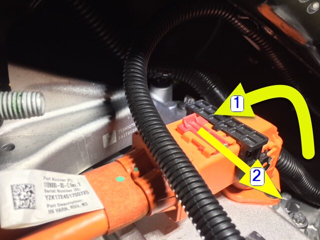 - 确认后驱动单元高压线束连接器的黑色释放杆处于打开位置,将连接器平直地安装到高压电池接头上,将释放杆固定到关闭位置,然后滑动红色连接器锁片。