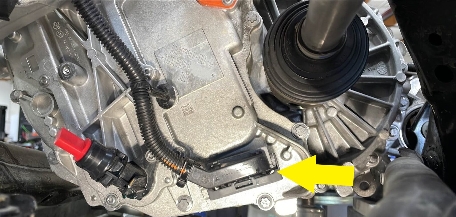 - 拉动红色锁片以松开,然后再次拉动红色锁片以断开后副车架线束与机油泵连接器的连接。