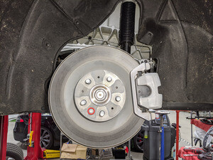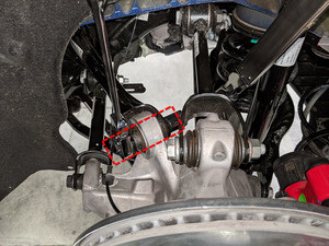 将左后制动钳从左后转向节上拆下,然后将其悬挂在车身上