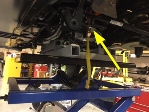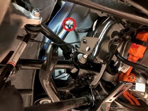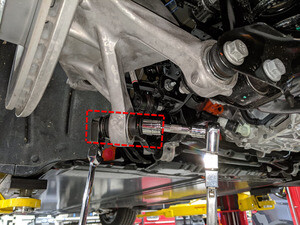 作为辅助检查,测量围板底部到轴中心的距离,以确保左悬架已设置到行驶高度