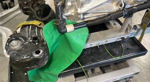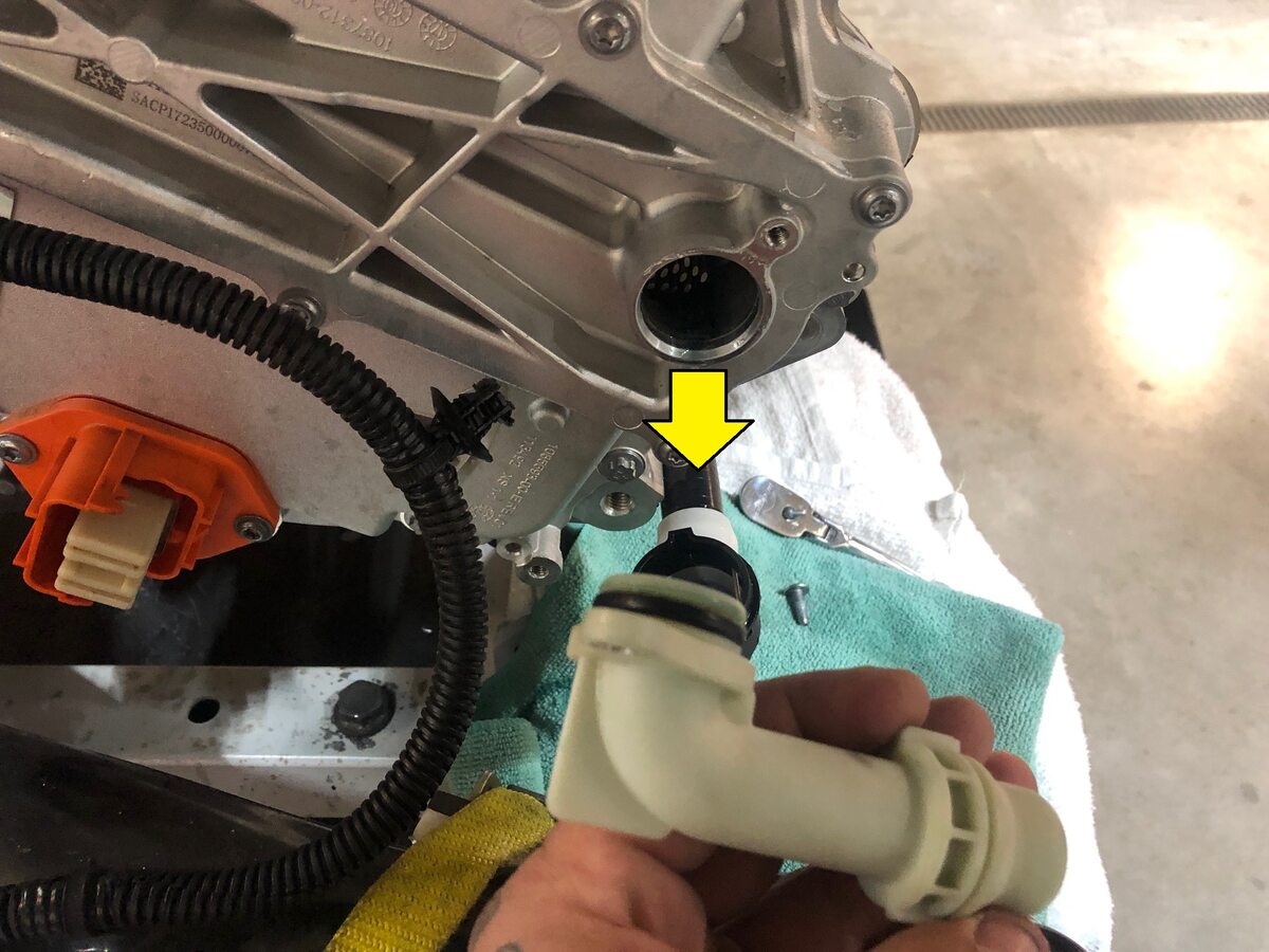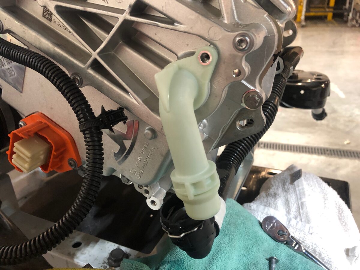 - 将前驱动单元逆变器入口软管连接到 90 度液力联轴节上,安装弹簧夹,然后执行推拉推测试,确保软管完全安装到位。