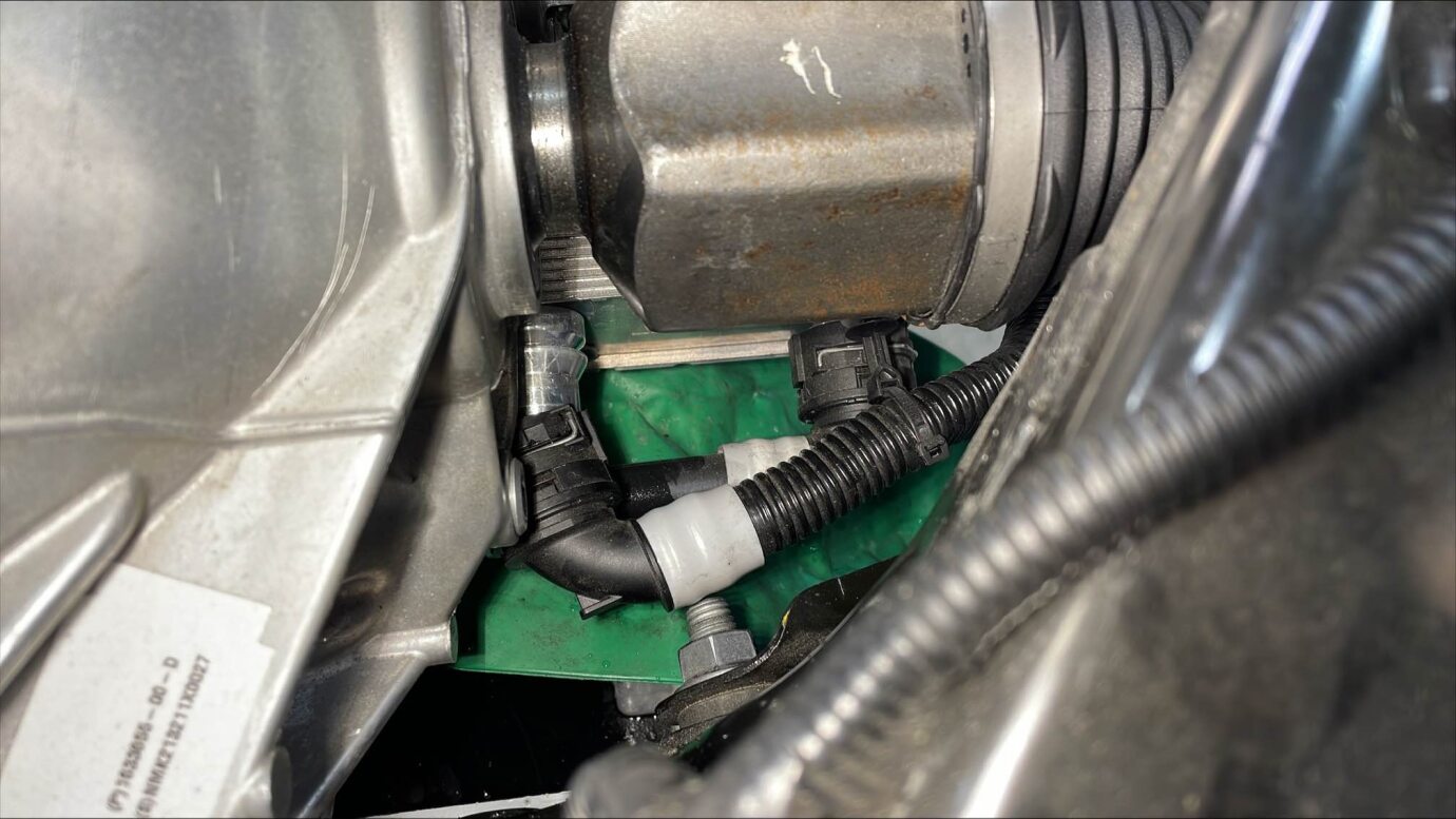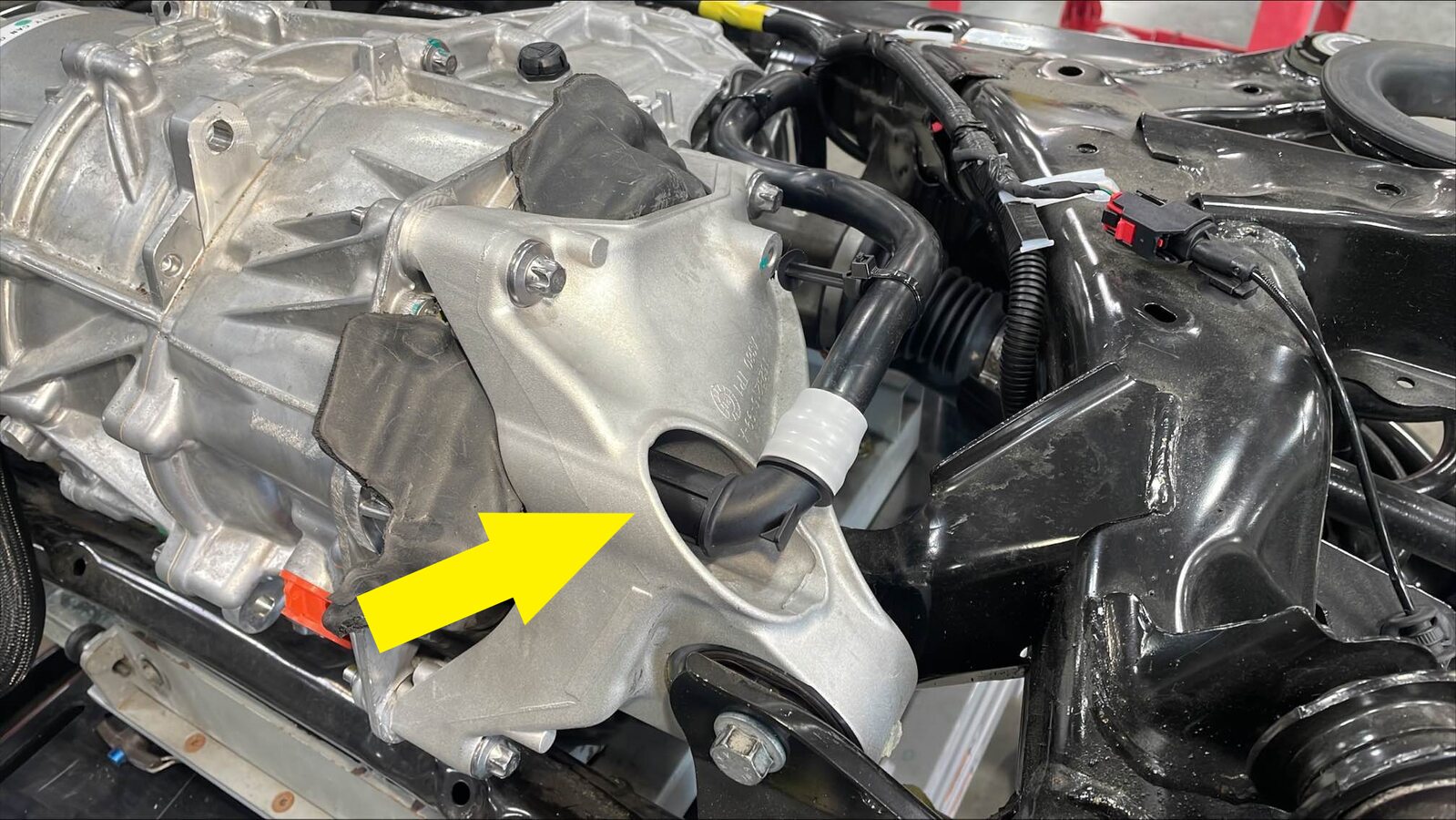 - Release clips (x3) that attach the rear drive unit coolant outlet hose to rear drive unit, and then manuever the hose out from between the drive unit and rear subframe.