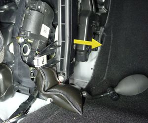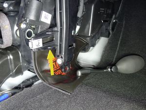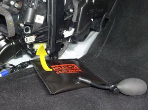- 将可充气袋向上插入到下部模式传动装置的底部,然后为气袋充气,使其在右侧横梁支架与下部 HVAC 总成之间鼓起。