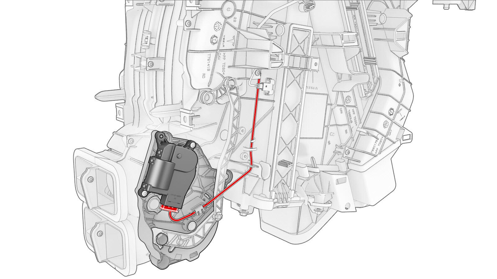 - 断开下部模式传动装置电气连接器,然后将传动装置从 HVAC 总成上拆下。