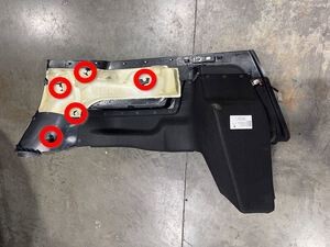 将行李箱 LH 侧饰板放入车内,然后安装将饰板下部固定到车辆的夹子 (x5)。