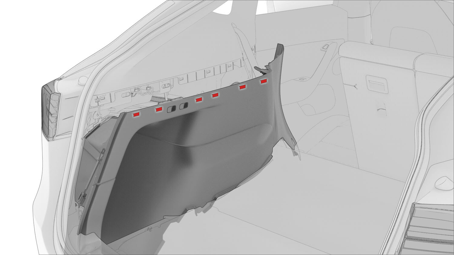 松开将后备箱左侧饰板固定到车辆的剩余卡子(6 个),然后将饰板从车辆上拆下。