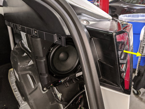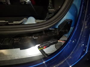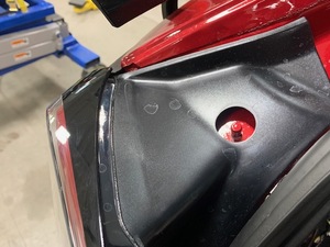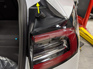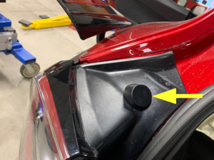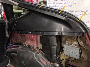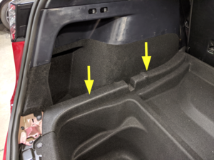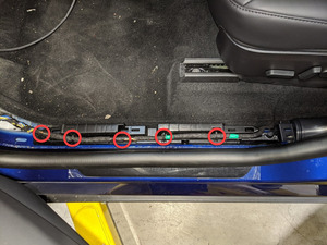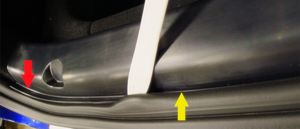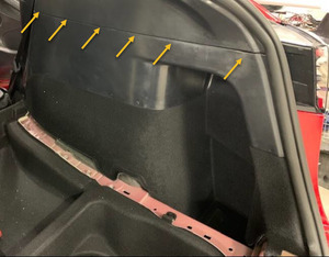 注5 个夹子;后边缘卡在行李箱侧饰板上的凹槽中;将 RH 后门槛饰板的后边缘安装到行李箱侧饰板,并一直朝前固定夹子