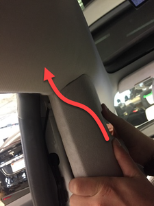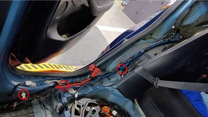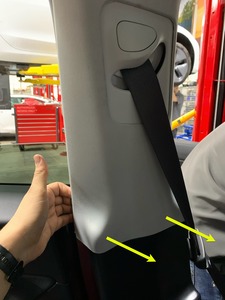 注4 个夹子;降下安全带滑块,使其与 B 柱面板对齐;将 B 柱上部的顶部插入顶蓬下方,以便与夹子对齐;按底部以便让 B 柱上部完全安装到 B 柱下部;确保密封条正确覆盖住饰板