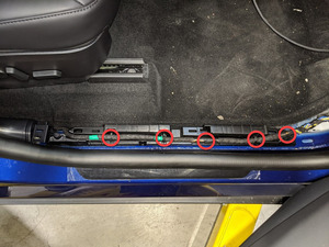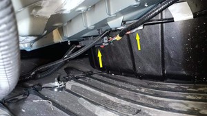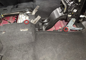 - 将 RH 前座椅线束固定到驾驶室 RH 前毡毯下方