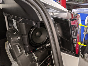 注1 个夹子,1 个锁片;对齐底部锁片,然后推动顶部夹子,完全就位中部 A 柱;将密封件拉过饰板