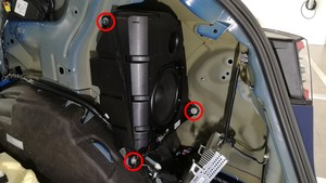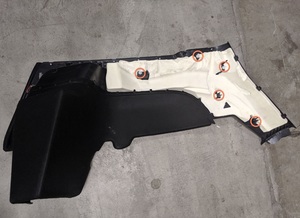 注5 个夹子;后边缘卡在行李箱侧饰板上的凹槽中;将 LH 后门槛饰板的后边缘安装到行李箱侧饰板上,并一直朝前固定夹子;根据车辆生产地点,饰板部件可能略有不同